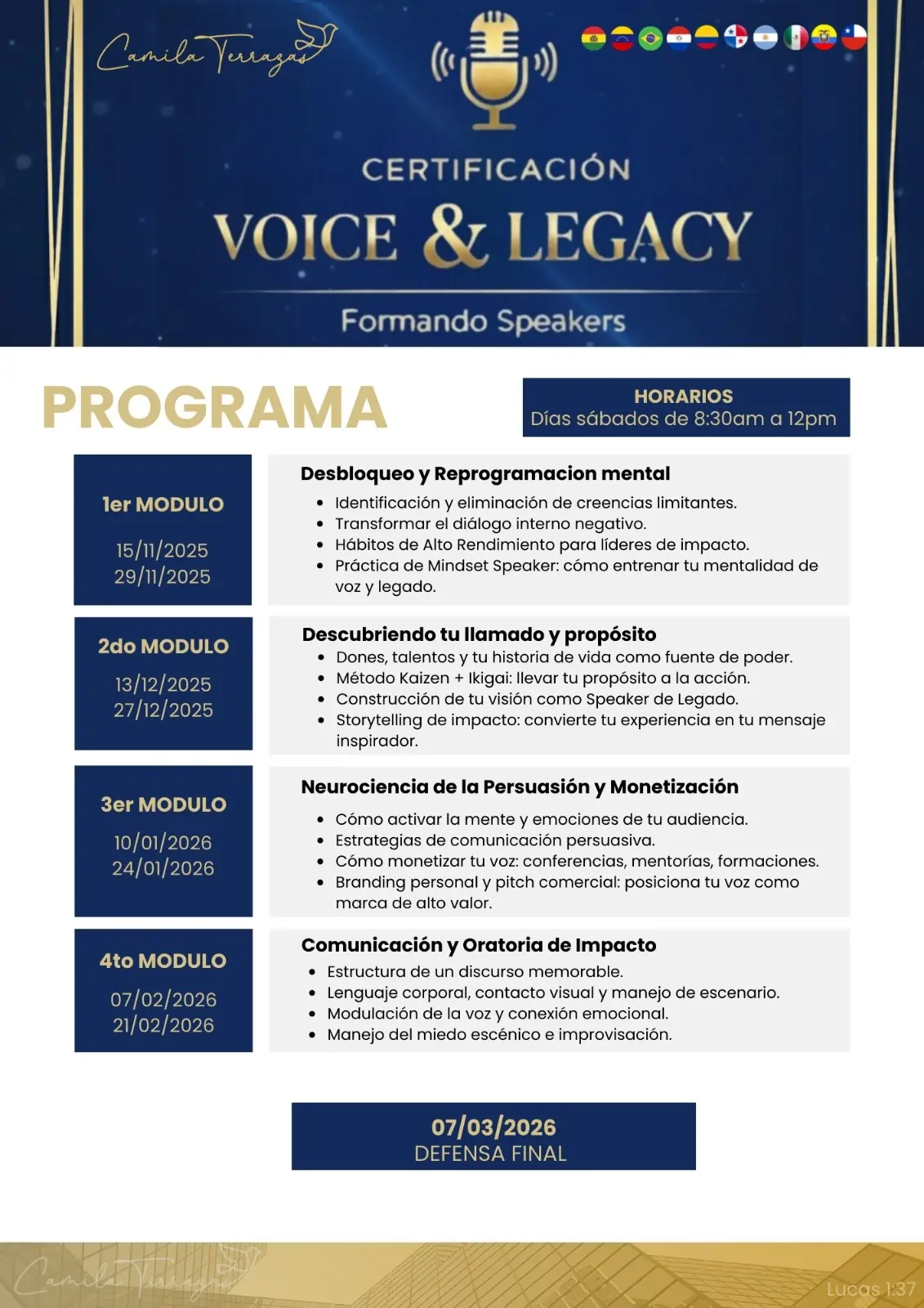 podrás transformar tu conocimiento en legado, ingresos y dominar el arte de hablar en cualquier escenario (online o presencial.)